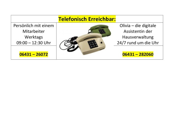 Ab dem 1. März 2026 erweitern wir unsere Dienstleistung für Sie um „Olivia“. Sie ist die neue digitale Assistentin der Hausverwaltung. Olivia erreichen Sie rund um die Uhr, also auch am Wochenende und in eventuellen Notfällen, unter ihrer Durchwahl 06431 282060.
