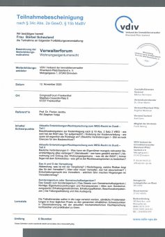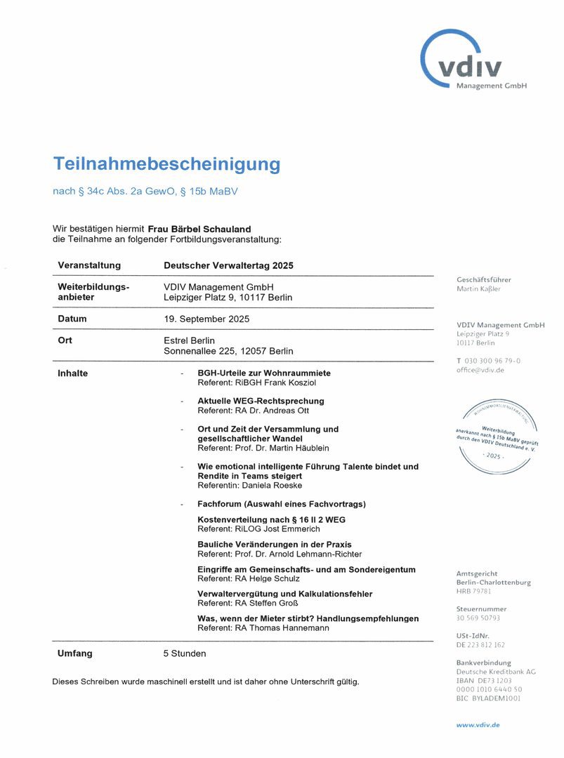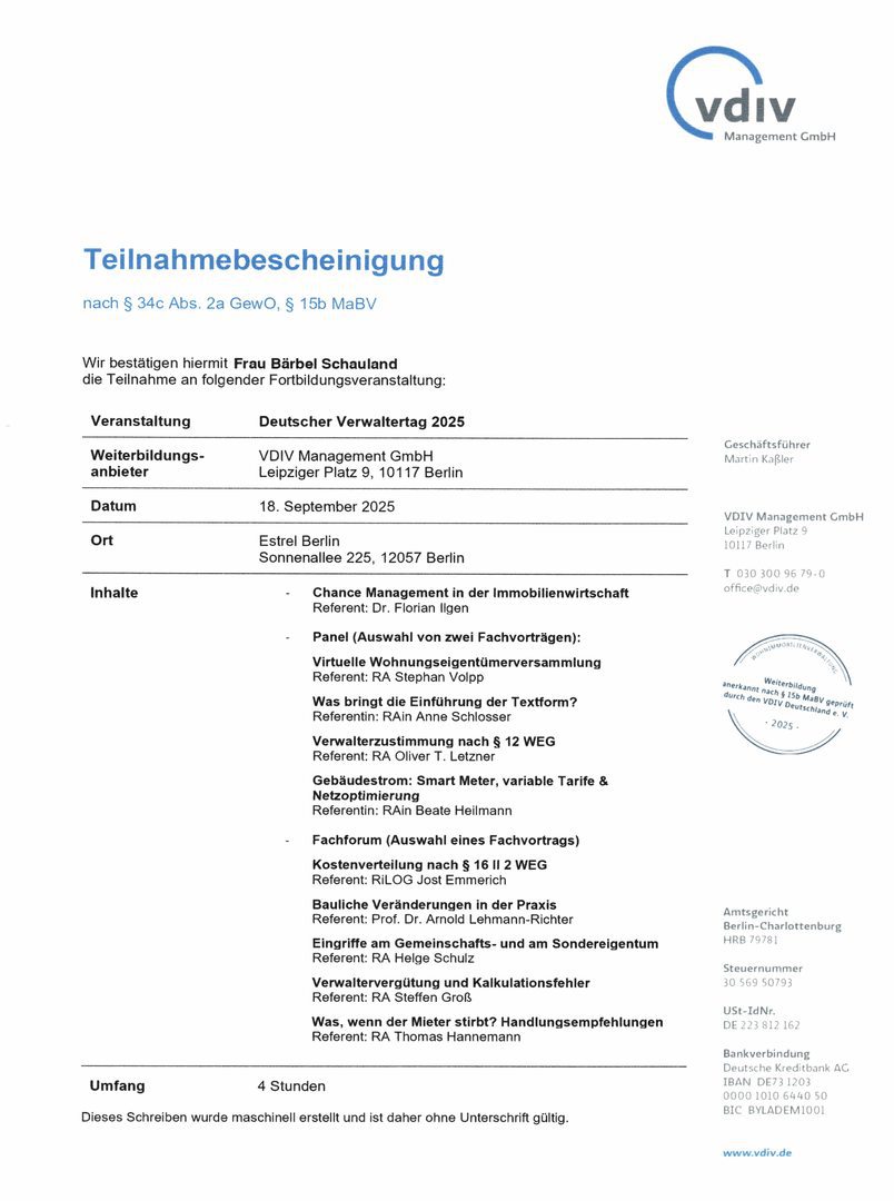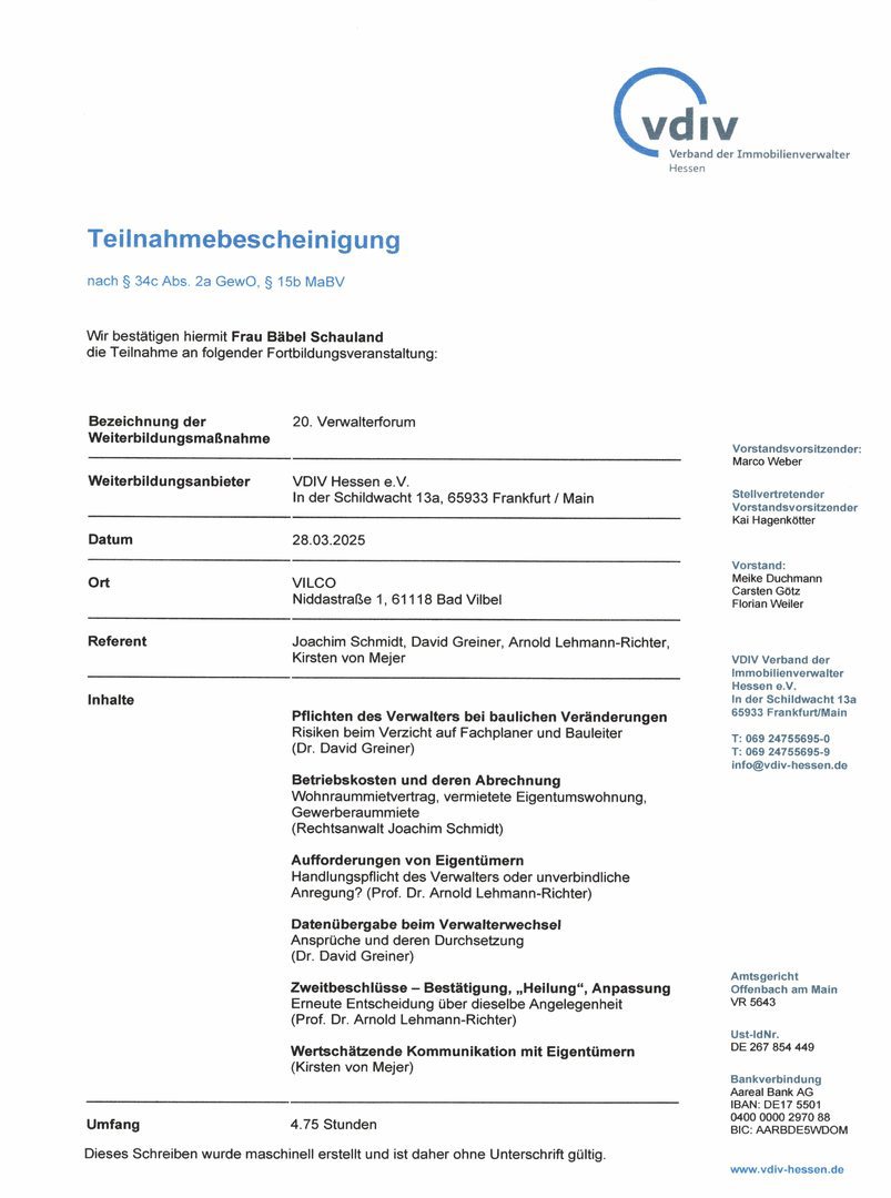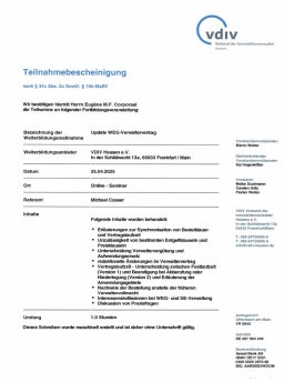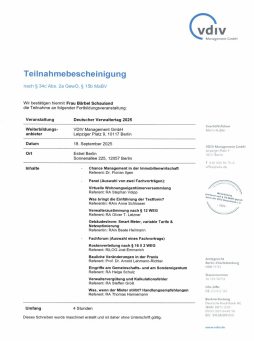 Der Gesetzgeber schreibt seit dem 1. August 2018 eine Weiterbildungspflicht über 20 Stunden in drei Jahren vor. Als Mitglied im Verband der Immobilienverwalter Hessen e.V. verpflichten wir uns zu eine erweiterte Weiterbildung für jeden Objektbetreuer auf mindestens 45 Stunden in drei Jahren.