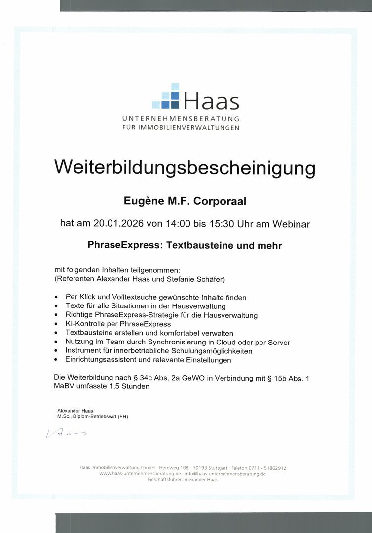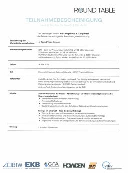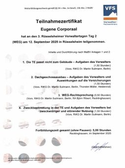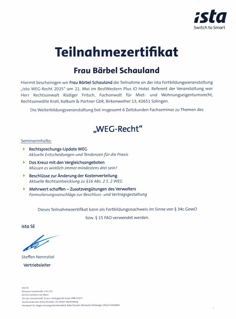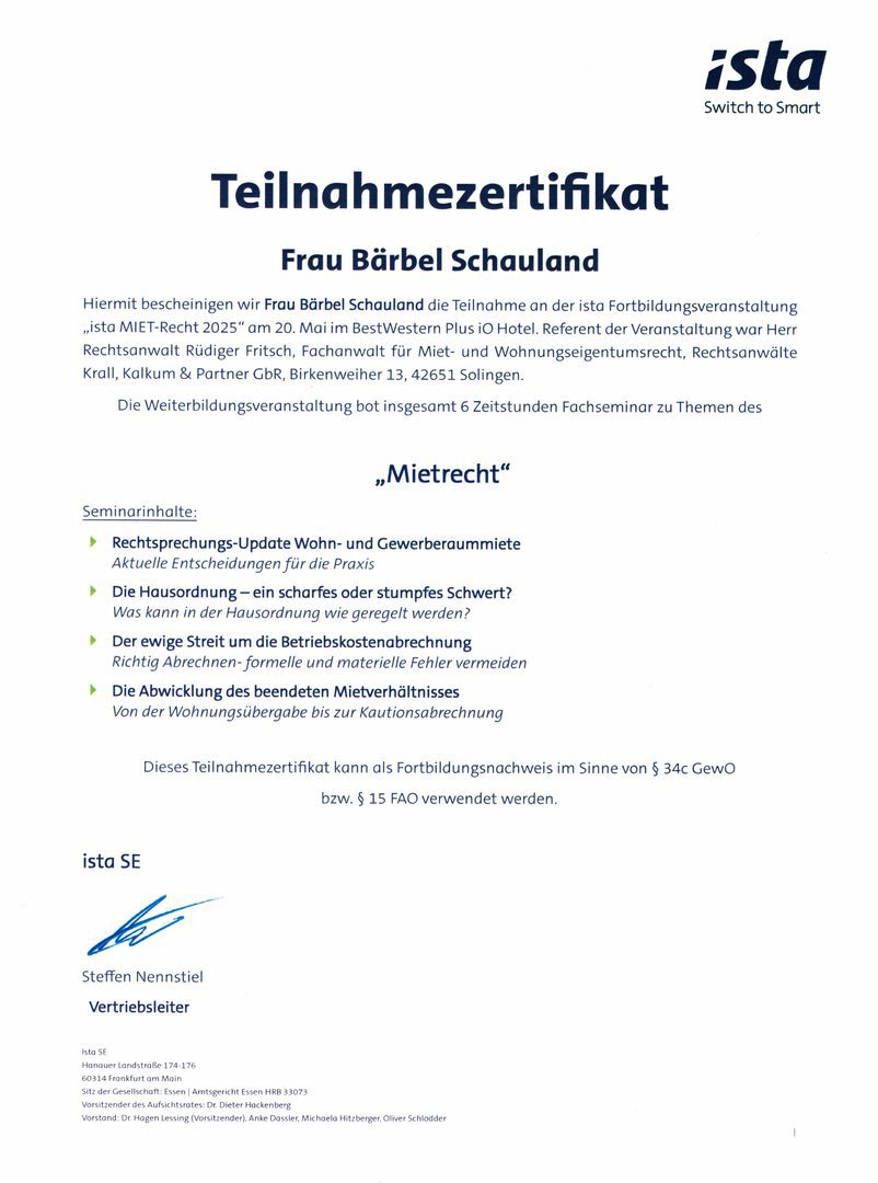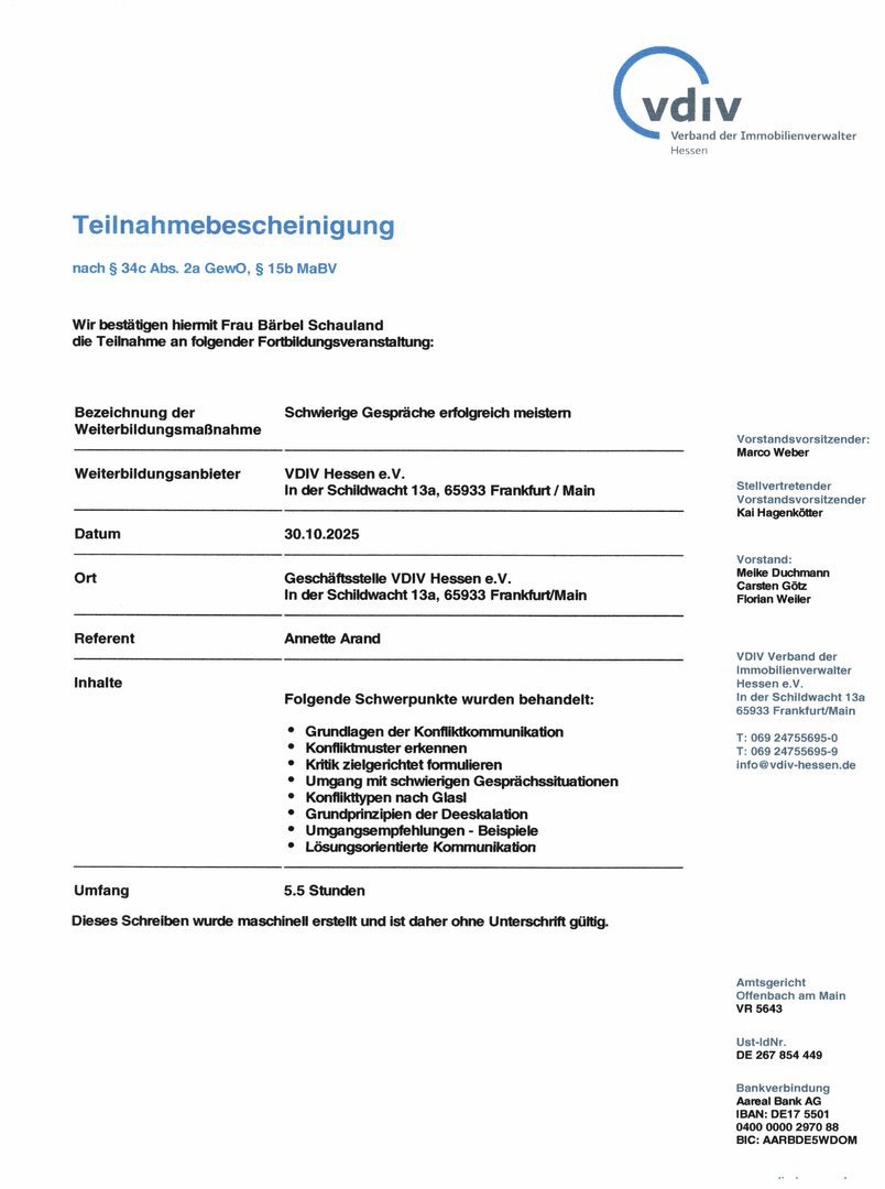 Der Gesetzgeber schreibt seit dem 1. August 2018 eine Weiterbildungspflicht über 20 Stunden in drei Jahren vor. Als Mitglied im Verband der Immobilienverwalter Hessen e.V. verpflichten wir uns zu eine erweiterte Weiterbildung für jeden Objektbetreuer auf mindestens 45 Stunden in drei Jahren.
